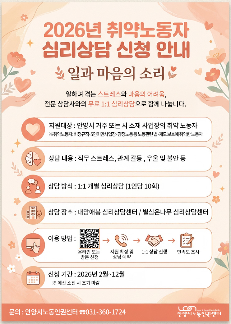 ■ 지원 대상: 안양시 거주자 또는 안양시 소재 사업장의 취약 노동자 - 취약노동자란? 비정규직, 5인 미만 사업장, 여성, 고령, 감정노동자 등 노동관련 법, 제도 보호에 취약한 노동자 ■ 상담 내용: 직무 스트레스 및 정서적 어려움, 직장 내 관계 갈등, 불안과 우울 ■ 상담 방식: 1:1 개별 심리상담(1인당 10회) ■ 상담 장소: 두 곳 중 택1(센터로 방문) - 내맘애봄 심리상담센터(안양시 동안구 시민대로 327번길 64,w에이스타워 5층) - 별심은나무 심리상담센터(안양시 동안구 시민대로 175, 동안프라자 404호) ■ 이용 방법 ① 온라인(QR링크, 신청서 메일로 제출) 또는 방문 신청 ② 지원 확정 및 상담 예약 ③ 전문 상담사와 1:1 심리상담 진행 ※ 모든 상담 내용은 비밀이 보장됩니다. ④ 만족도 조사 참여 ■ 신청 기간: 2026년 2월 ~ 12월 ※ 예산 소진 시 조기 마감될 수 있습니다. ■ 문의: 안양시노동인권센터 ☎ 031-360-1724 |