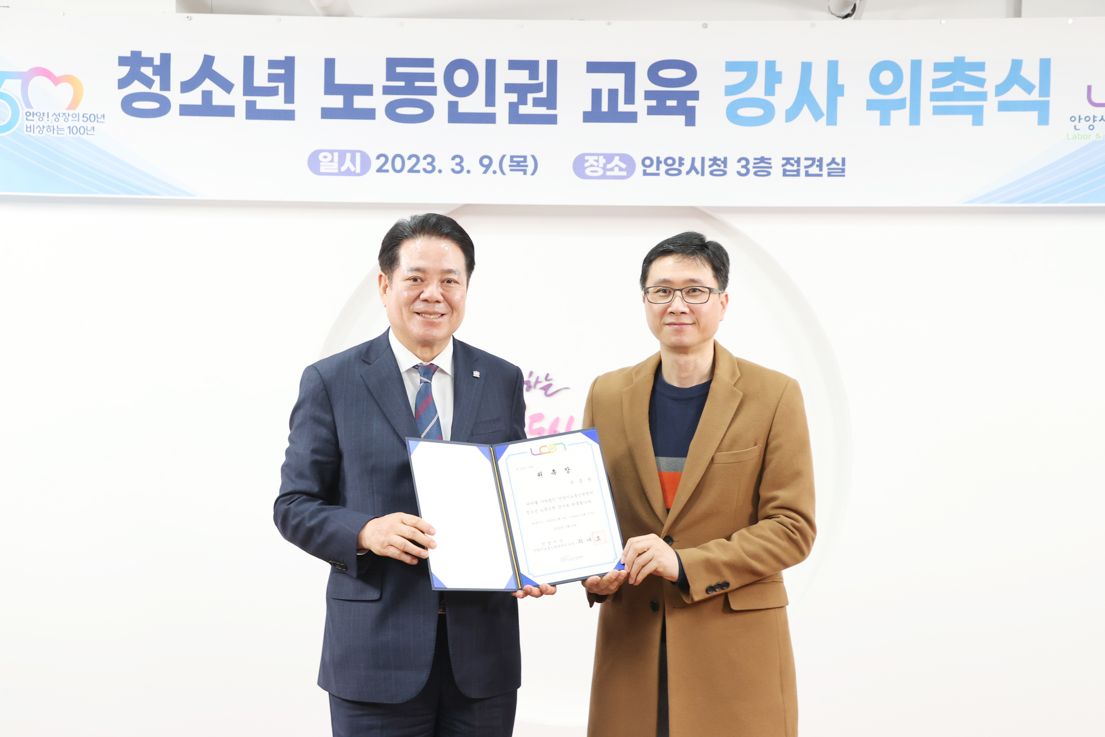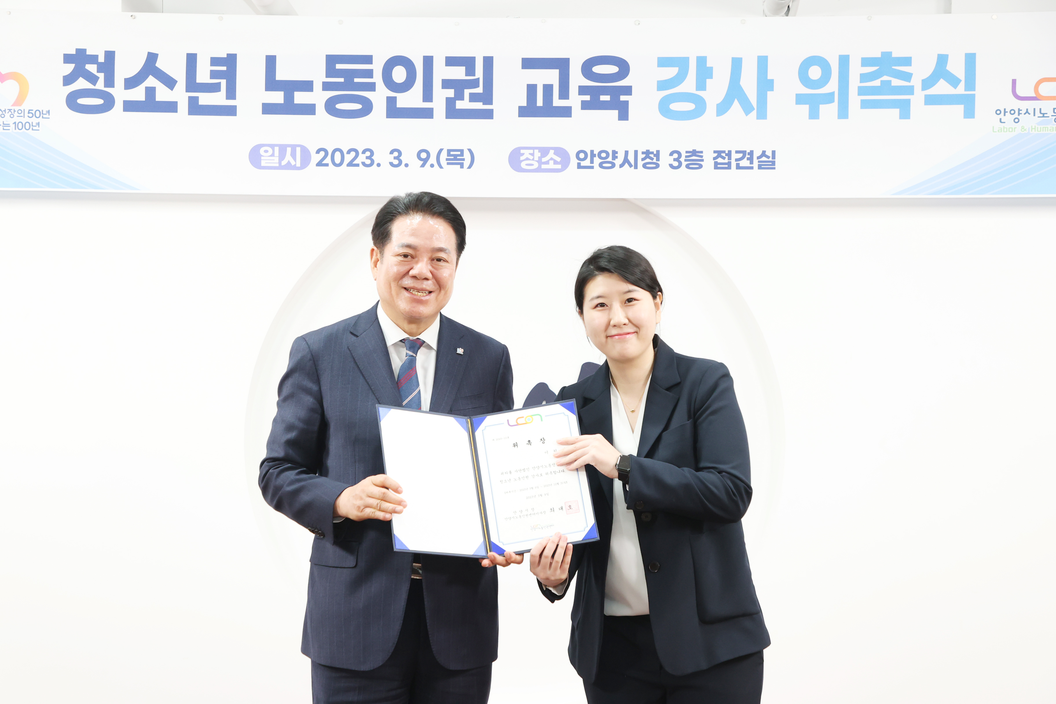 청소년 노동인권 교육 강사 위촉식 - 일시 : 2023. 03 09. 10:00 - 장소 : 시청 접견실